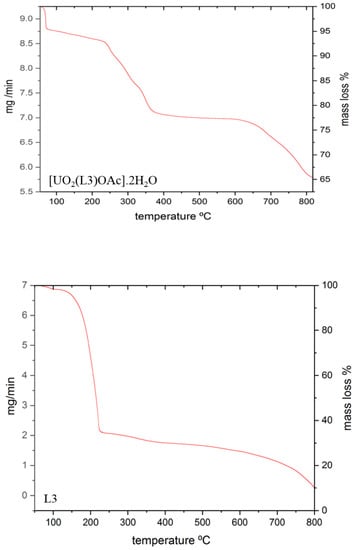 | [UO2(L3)OAc]·2H2O | 527.28 | Light orange | 69.6 | 204–390 | 26.56 | 27.65 (27.67) | 2.77 (2.86) | 7.69 (7.45) | 19.53 (19.85) |