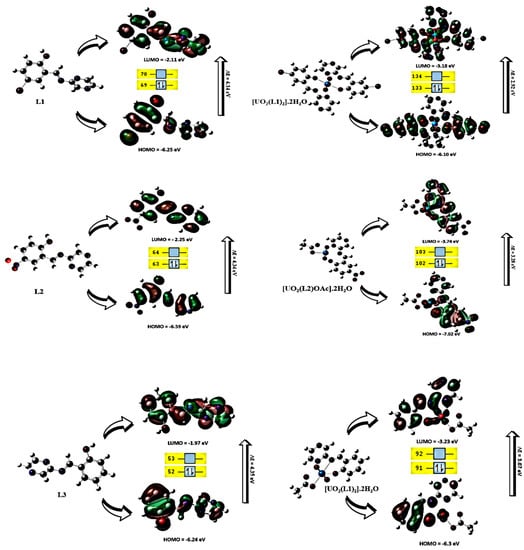 | [UO2(L2)OAc]·2H2O | −7.02 | −3.74 | 3.28 | 5.38 | 1.64 | −5.38 | 0.61 | 0.30 | 8.82 | 3.28 |