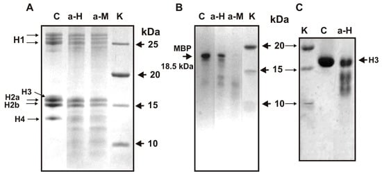 SDS-PAGE analysis of five H1-H4 histones hydrolysis by IgGs against five histones (lane a-H) and MBP (lane a-M) (A) as well as MBP by anti-histones (lane a-H) and anti-MBP IgGs (lane a-M) (B). Hydrolysis of homogeneous H3 histone by IgGs against five histones (C). Lane C correspond to hive histones (A), and MBP (B) and homogeneous H3 (C) incubated in the absence of IgGs. Lane K corresponded to proteins with known molecular masses (A–C). Five histones, MBP and homogeneous H3 in the absence and in the presence of IgGs (0.03 mg/mL) were incubated for 10 h.