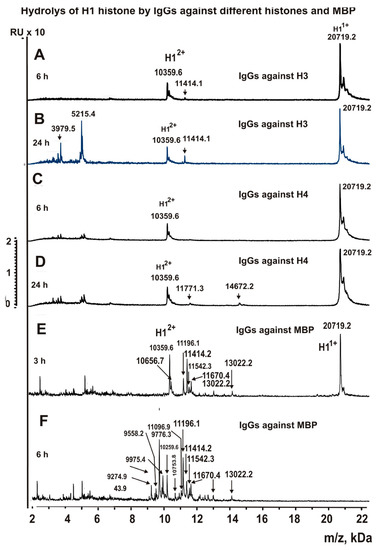 The IgG fractions with high affinity to five individual histones and to MBP were used to reveal the cleavage sites of histone H1 by MALDI TOFF mass spectrometry. After the addition of these IgGs (Figure 2A), H1 histone was nearly homogeneous: there were only two signals of its one- (m/z = 20719.2 Da) and two-charged ions (m/z = 10359.6 Da).