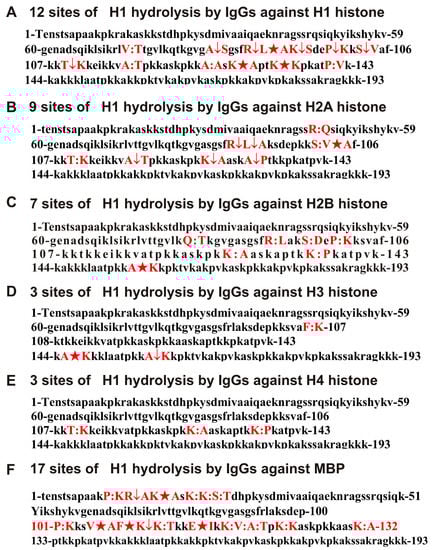 Sites of H1 hydrolysis by IgGs against H1 (A), H2A (B), H2B (C), H3 (D), H4 (E), and MBP (F). Major sites of H1 splitting are shown by stars (★), moderate ones by arrows (↓), and minor sites of the cleavages by colons (:) (A–F).