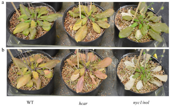 Phenotype of WT, hcar, and nyc1/nol plants during natural senescence: (a) 70-day-old WT, hcar, and nyc1/nol plants grown in soil; (b) 81-day-old WT, hcar, and nyc1/nol plants grown in soil.