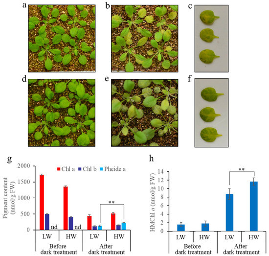 Phenotypic and Chl metabolic characterization of WT plants grown in soil with different water content during dark-induced senescence. (a–c) The phenotype of WT plants before (a) and after (b,c) 7 days of dark treatment. Plants were grown in soil with a low water content. (c) No. 5–6 leaves were detached from dark-treated WT plants. (d–f) The phenotype of WT plants before (d) and after (e,f) 7 days of dark treatment. Plants were grown in soil with a high water content. (f) No. 5–6 leaves were detached from dark-treated WT plants. (g) Chl and Pheide a contents in No. 5–6 leaves before and after intact plant incubation in darkness. (h) HMChl a content of leaves No. 5–6 before and after intact plant incubation in darkness. Values are the mean ± SD of three independent experiments. LW indicates soil with a low water content (approximately 70% moisture), and HW indicates soil with high water content (saturated moisture). Asterisks indicate significant differences (Student’s t-test, ** p < 0.01). nd indicates that the pigments content was not detected.