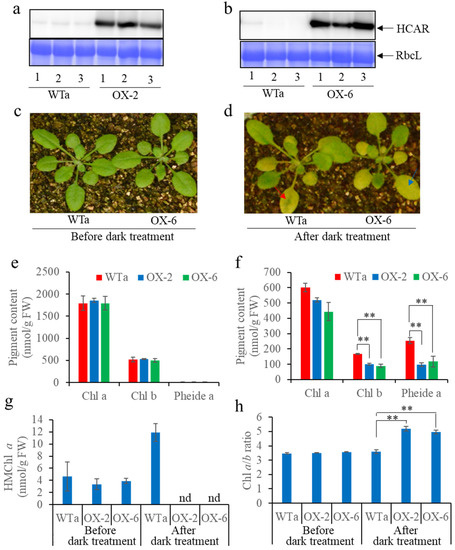 HMChl a and Pheide a accumulated in WT plants when whole plants were placed in darkness to induce senescence. To demonstrate whether the activity of HCAR was limited by the treatment, HCAR was overexpressed in WT plants. The Western blotting results showed that HCAR was overexpressed in the OX-2 and OX-6 lines (Figure 4a,b). There was no visible difference between the HCAR-overexpressing lines and WT plants during development (Figure 4c). After whole plants were treated in darkness for seven days, “green island” symptoms appeared in the senescent leaves of the WT plants, while the symptoms were alleviated by overexpressing HCAR (Figure 4c,d). Chl and metabolic intermediates were subsequently analyzed by HPLC. The results showed that, after seven days of dark-induced senescence, the HCAR-overexpressing lines retained less Chl a and b, had higher Chl a/b ratios, and accumulated less Pheide a than WT (Figure 4e,f,h). In WT plants, HMChl a was increased after senescence, while it was almost undetectable in the HCAR-overexpressing lines (Figure 4g). The results indicate that the activity of HCAR is insufficient in WT during dark-induced senescence, resulting in HMChl a accumulation and additive Pheide a accumulation. Therefore, non-PCD symptoms with “green islands” appeared during dark-induced senescence.