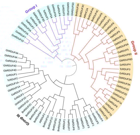 The Pfam family of DUF1117 (PF06547) was used as a query to search for RDUF. At the same time, the AtRDUF amino acid (aa) sequences of AtRDUF1 (AT3G46620), AtRDUF2 (AT5G59550), and AtRHC2A (AT2G39720) in Arabidopsis were used for the BLASTp search in the Gossypium protein database. We detected 6, 7, 14, and 14 RDUF genes in the A2, D5, AD1, and AD2 genomes, respectively. We observed that the RDUF gene number in the tetraploid G. hirsutum and G. barbadense was probably twice than that observed in the diploid cottons (G. arboreum and G. raimondii), suggesting hybridization and whole genome duplication (WGD) events. Meanwhile, 3 TcRDUF genes in cacao (Theobroma cacao), 10 GmRDUF genes in soybean (Glycine max), 12 BnRDUF genes in oilseed (Brassica napus), and 7 HaRDUF genes in sunflower (Helianthus annuus) were also detected. The phylogenetic tree showed that the 76 RDUF proteins were categorized into 3 groups: Group I, Group II, and Group III (Figure 1). In addition, we also found that the RDUF family proteins were clustered closely in the different species, indicating that RDUF proteins evolved independently after separation from other species. Another phylogenetic tree containing monocotyledonous crop RDUFs was built, including three OsRDUF proteins from Oryza sativa, five ZmRDUF proteins from Zea mays, and eight TaRDUF proteins from Triticum aestivum (Table S2). The RDUFs in monocotyledonous crops were clustered far from those found in dicotyledonous crops (Figure S1, in green clade), suggesting that the RDUFs in monocotyledonous and dicotyledonous crops likely evolved independently. The RDUF-protein phylogenetic trees from the four cotton species were also analyzed. We found that the RDUF members in all four species were categorized into three groups (Figure S2).