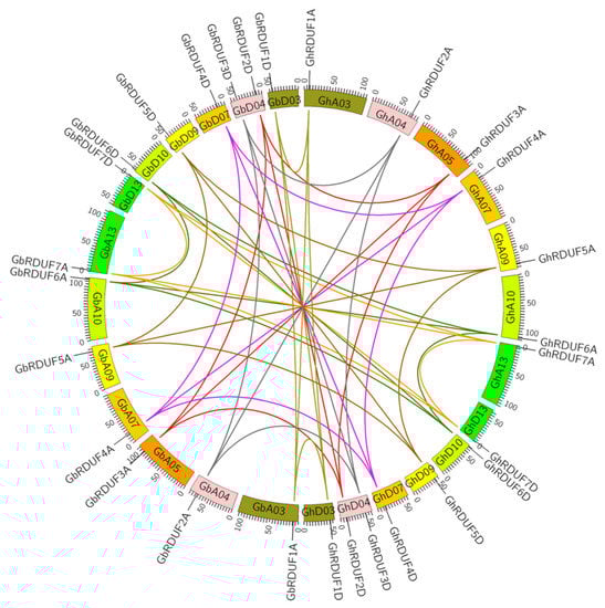 To reveal the homolog relationships between the RDUF genes in Gossypium, gene localization on chromosomes as well as gene synteny analysis were performed. The results showed that the RDUF genes in diploid cotton species were distributed on six chromosomes, with two GrRDUF genes localized on chr12 in G. raimondii. In tetraploid cotton species, we observed that seven RDUF genes of the At subgenome were distributed on seven chromosomes, with each RDUF gene located on one chromosome. The seven RDUF genes of the Dt subgenome were located on six chromosomes, with RDUF2D and RDUF3D located on the D04 chromosome (Figure S3). Gene localization analysis revealed that most of the RDUF loci were highly symmetric between the At and Dt subgenomes. RDUF gene localization in the At subgenomic chromosomes consistently agreed with their homologs in the Dt subgenomic chromosomes. Nevertheless, RDUF2A and RDUF3A were located on the A03 and A04 chromosomes, respectively, but their homologs, RDUF2D and RDUF3D, were all located on the D04 chromosome.