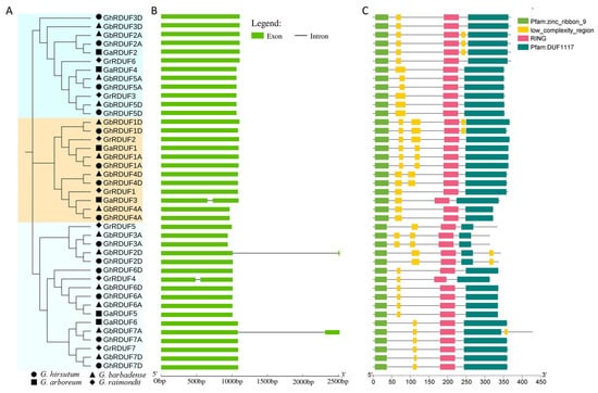 Gene structure and conserved domains in RDUF members in Gossypium. (A) Phylogenetic tree of RDUF proteins in four cotton species. (B) Gene structure of exons and introns in RDUF genes. (C) The conserved domains in RDUF proteins.