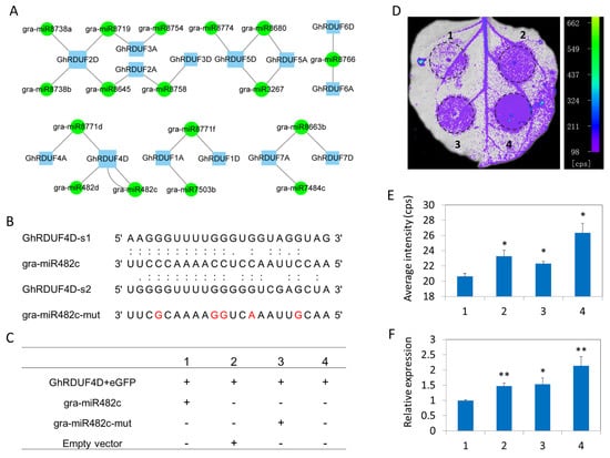 miRNAs targeting the GhRDUF genes, and the regulatory network of GhRDUF4D and gra-miR482c. (A) Network of miRNAs and the target GhRDUFs. The predicted regulation miRNAs are shown on a green background in circles, the target GhRDUF genes are marked with blue rectangles. The regulation and targeting level are shown with varying degrees. (B) The base-pairing interaction between gra-miR482c and GhRDUF4D, and the sequence of mutant gra-miR482c. The five point mutations in gra-miR482c-mut are marked in red. (C) Vector groups in transient expression assays for each lane. (D) Co-infiltrated tobacco leaves photographed under ultraviolet light. The same areas marked by circular dotted lines were used for fluorescence intensity and gene expression analyses. (E) The average fluorescence intensity in each lane. (F) Relative expression levels of GFP in each lane. Mean ± standard error (SE), n = 3. “*” and “**” indicate that the data were significantly different at the p values of <0.05 and <0.01, respectively.
