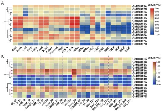 Expression patterns of GhRDUF genes in upland cotton development and under abiotic stresses. (A) Expression profiles of GhRDUF genes in cotton tissues and during development. DO and DF indicate the DPA ovule and fiber, respectively. (B) Expression profiles of GhRDUF genes under abiotic stresses. FPKM in log2 scale was used for heat map visualization.