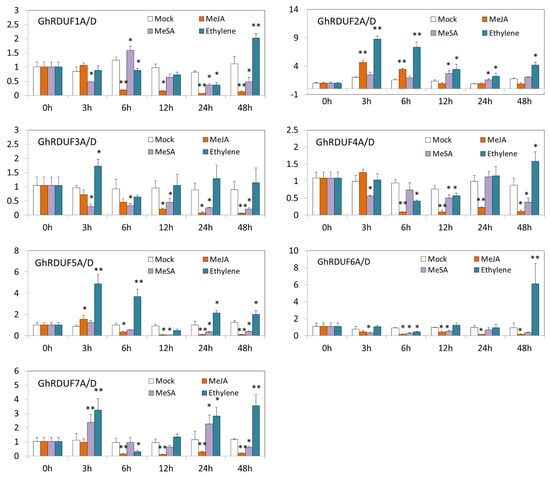 Expression profiles of GhRDUF genes under plant hormone treatments. Mean ± SE, n = 3. “*” and “**” indicate that the data were significantly different at the p values of <0.05 and <0.01, respectively.