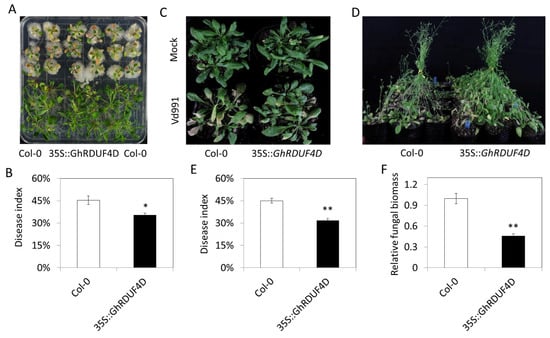 Overexpression of GhRDUF4D conferred V. dahliae resistance in Arabidopsis. (A) Col-0 and OE::GhRDUF4D plants inoculated with Vd991 in MS medium plate; (B) statistical analysis of disease index in plants in MS medium; (C,D) pathogenetic phenotypes of Col-0 and OE::GhRDUF4D plants at 10 and 20 dpi; (E,F) statistical analysis of the disease index and relative fungal biomass in plants in the soil. Mean ± SE, n = 3. “*” and “**” indicate that the data were significantly different at the p values of <0.05 and <0.01, respectively.