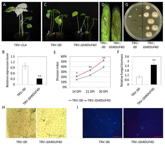 To investigate the biofunction of GhRDUF4D in the relationship between upland cotton and V. dahliae, the VIGS approach based on TRV was used to knockdown GhRDUF4D transcription levels in upland cotton. When the true leaves of the cotton seedlings were inoculated with TRV::CLA1, Agrobacteria revealed a photobleaching phenotype (Figure 9A), and the expression of GhRDUF4D was downregulated in TRV::GhRDUF4D plants (Figure 9B). The seedlings were inoculated with V991 upon reaching the three-leaf stage. The results showed that the upland cotton seedlings with GhRDUF4D downregulation were more susceptible to V. dahliae than the control (TRV::00). Indeed, GhRDUF4D-silenced plants displayed more wilting and yellow leaves, and a deeper vascular discoloration in stem tissues (Figure 9C,D). The quantification of the disease index in GhRDUF4D downregulated seedlings was higher than that of the control (Figure 9E). Fungal DNA abundance detection and fungal recovery assays displayed that greater amounts of V. dahliae had colonized the stem tissue of GhRDUF4D-silenced plants than the control (Figure 9F,G).