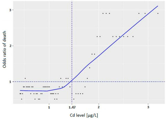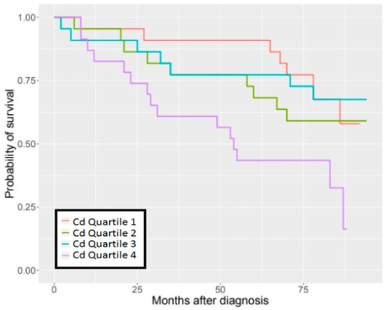 In a recent study, we suggested that in patients with stage I lung cancer, low serum selenium levels (<69 µg/L) at the time of diagnosis was associated with an increased risk of death (HR−2.73, p = 0.01) [16]. In this study we analysed blood concentrations of As, Cd, Hg and Pb in a group of patients with lung cancer. We observed that low Cd levels in patients with stage IA lung cancer are associated with improved overall survival. Patients in the highest [Cd] quartile (blood Cd > 1.97–7.77 µg/L) had a seven-fold increased risk of death during the 96 months of follow-up (HR = 7.36, p < 0.01). The cut-off point of Cd concentration was 1.47 µg/L. This suggests that lower blood levels of Cd (below 1.47 µg/L) are associated with improved overall survival in patients with this disease.