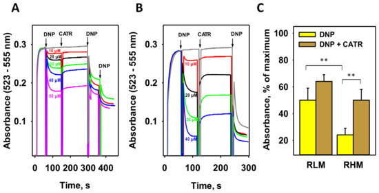CATR recovers the DNP-mediated decrease in mitochondrial membrane potential (MMP) in isolated rat mitochondria. Representative recordings of MMP in rat liver mitochondria (A) and heart (B) mitochondria correspond to changes in the absorbance of the potential-sensitive dye safranin O (15 µM). CATR was added at a final concentration of 3 µM; the concentration of DNP (unless otherwise indicated) was 50 µM. The gray line represents the control measurement without the addition of CATR or DNP. (C) Quantification of MMP recovery by CATR (brown) in the presence of 30 µM DNP (yellow, brown). Data are the mean ± SD of at least three independent experiments; ** p < 0.01. For other conditions, see Section 2 (Materials and Methods).