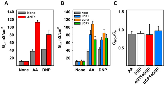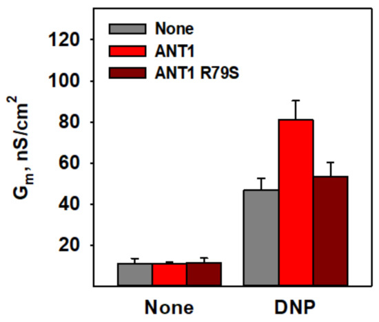 Figure 2A shows that the specific conductance of membranes containing DNP in the presence of ANT1 (ANT1 + DNP, red column; Gm = 80.9 ± 9.4 nS/cm2) was approximately double that of membranes containing only DNP at a concentration of 50 µM (DNP, gray column; Gm = 42.7 ± 5.9 nS/cm2). Until now, only FAs have been shown to activate ANT1 directly (Figure 2A) [18,26,51,52].