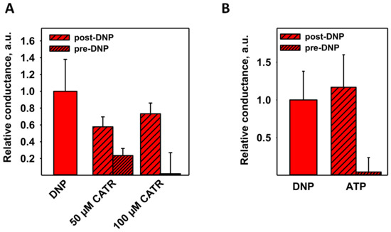 Because CATR was able to partially restore MMP in mitochondria treated with DNP (Figure 1), we tested whether its addition would deplete the proton transport mediated by DNP in the presence of reconstituted ANT1. Interestingly, CATR decreased Gm more effectively if added prior to DNP (Figure 3A). The decrease was more pronounced at the higher CATR concentration of 100 µM (~98%), indicating the specificity of the interaction.