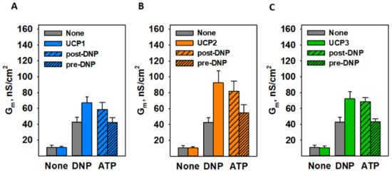ATP was shown to be an inhibitor of FA-activated ANT1 [26], so we examined its effect on DNP-mediated proton transport as well. Figure 3B shows that 4 mM ATP inhibited the effect of DNP by ~96%, further suggesting the same putative binding site for DNP, CATR, ATP, and FA. The total membrane conductance (Gm) values of Figure 3 are shown in Figure S2. ATP inhibited the UCP1–UCP3-enhanced DNP-mediated uncoupling in the same manner as it did in case of ANT1 (Figure 4).