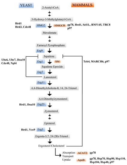 In mammals, the homolog of yeast Erg1 is squalene monooxygenase (SM, also see above and Figure 2). Early work indicated that the degradation of SM is proteasome-dependent and is triggered by increased cholesterol. This contrasts with the situation with Erg1, in which degradation is lanosterol-dependent (i.e., via an intermediate) [71]. Proteasome inhibition increased levels of ubiquitinated SM, which further increased upon treatment with cholesterol. Nevertheless, there is some conservation of the mechanisms controlling Erg1 and SM degradation. Most notably, Teb4, the mammalian homolog of Doa10, similarly ubiquitinates and degrades SM in HEK cells [27]. In addition to Teb4, another E3 ubiquitin ligase (MARCH6) associates with and contributes to the degradation of SM [25,30].