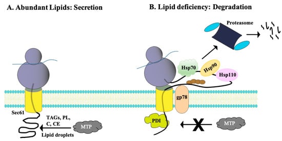 ApoB is an unconventionally regulated ERAD substrate because it is co-translationally degraded [88,89]. As ApoB is translocated into the ER through the Sec61 translocon while still attached to the ribosome [89,90], the microsomal triglyceride transfer protein complex, MTP, delivers triacylglycerols, phospholipids, cholesterol, and cholesteryl esters from the ER membrane and ER lumenal lipid droplets onto ApoB (Figure 3A). These lipids are assembled onto so-called lipid associating domains in ApoB [91,92,93,94,95]. This lipid loading event is further facilitated by pause transfer sequences that are encoded within ApoB. More specifically, the sequences slow translocation so the lipids can bind more readily to β-sheet-rich stretches in the lipid associating domains in ApoB [96,97,98]. Once lipidated via these steps in the ER, the primordial particle is next transported to the Golgi complex for further lipidation. Ultimately, a lipoprotein particle is formed, one that become a very low-density lipoprotein (VLDL) particle or a chylomicron in the liver or intestine. These particles are secreted into the circulatory and lymphatic systems [99,100,101].