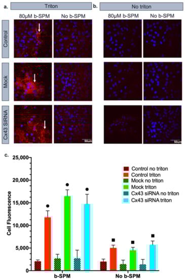 For the experimental groups, we measured cell fluorescence as a semi-quantitative measure of b-SPM uptake into control astrocytes (DMEM), mock-transfected astrocytes (DMEM + 1.2 µL of HiPerFECT), and those transfected with siRNA targeting Cx43 (DMEM + 20 nM of siRNA targeting Cx43 + 1.2 µL of HiPerFECT). We found significant uptake of b-SPM into astrocytes of all three experimental triton groups when compared with the no triton control and the no b-SPM groups. The level of uptake was similar for all three treatments including astrocytes in which Cx43 was knocked down, which suggests that Cx43 is not a major pathway for SPM uptake under these conditions (no statistical difference was found among these groups).