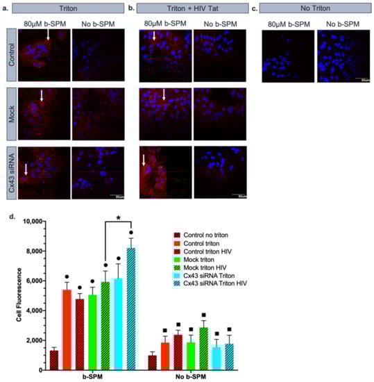 HIV-Tat further increased b-SPM uptake/accumulation only when Cx43 HC were knocked down. Rho-avidin was used to visualize b-SPM (red), and DAPI was used to visualize the nuclei (blue). The presence of b-SPM is marked with the white arrows. (a,b) Qualitative representation of the data (n = 3/group). Control, mock (only treated with HiPerFect), and siRNA specific to Cx43 (+/−HIV-Tat) astrocytes were incubated in either 80 µM of b-SPM and no b-SPM with (PBS). (c) No triton and no b-SPM samples were used as negative controls. Calibration bar is the same for all images (50 µm). (d) Quantitative representation of the data (n = 3/group). Asterisk (*) indicates a significant difference (p < 0.05) mock triton HIV and Cx43 siRNA triton HIV. Black squares (■) represent samples statistically significant (p < 0.05) with b-SPM samples. Black circles (•) are the samples that are statistically significant with control no triton.