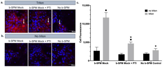 PTI significantly reduced the b-SPM uptake. Rho-avidin was used to visualize b-SPM (red), and DAPI was used to visualize the nuclei (blue). The presence of b-SPM presence is marked with the white arrows. (a,b) Qualitative representation of the data. Mock (only treated with HiPerFect) and mock + PTI astrocytes were exposed to 80 µM of b-SPM and no b-SPM (PBS). No triton and no b-SPM samples were used as negative controls. Calibration bar is the same for all images (50 µm). (c) Quantitative representation of the data (n = 3/group). Asterisks (*) indicate a statistically significant difference (p < 0.05) compared with the b-SPM mock triton group. Black squares (■) indicate a statistically significant difference (p < 0.05) between the no triton and the triton groups.