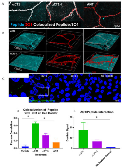 These initial barrier function findings in MDCK cells demonstrated the barrier function-modulating potential of the 9 amino acid (aa) CT-most sequence of Cx43. These observations further indicated that αCT1′s mechanism of action likely involved ZO1 binding competency. To confirm that αCT1 interacts with ZO1 inside the cell, αCT1′s association with the tight junction protein, ZO1, was investigated. We first examined αCT1 uptake and distribution in MDCK cells using confocal microscopy. Cx43-negative MDCK cells (Figure 1A) were used in this analysis to reduce confounding binding of the αCT1 and αCT1-I to Cx43 itself, a characteristic of both peptides that we have demonstrated previously [32]. Consistent with results from HeLa cells [32], we observed robust antennapedia peptide-mediated uptake into MDCK cells. However, unlike HeLa cells, MDCK cells incubated with αCT1 showed dense concentrations of peptide co-localized with ZO1 at cell–cell borders (Figure 1C). This pattern appeared to occur in a dose-responsive manner (Figure 1B), with signal intensity increasing with increasing concentrations of applied αCT1- from 5, to 100 to 150 µM. This distinctive co-localization is illustrated further in a 3D-volumetric rendering in Figure 2B, where αCT1, but not αCT1-I, can be seen to uniformly and intensely co-localize with ZO1 at an interface containing the tight junction belt between apposed cells. Quantitative analyses confirmed that αCT1 colocalized with ZO1 at cell borders at significantly higher levels than the ZO1 binding-incompetent peptide αCT1-I, antennapedia (ANT) peptide alone (i.e., with no additional Cx43-related sequence), and vehicle controls, with no added peptide (Figure 2A,C). To further substantiate αCT1-ZO1 association, we performed proximity ligation assays (Duolink) using antibodies against ZO1 and the biotin tags present on αCT1 and αCT1-I peptides. Punctate ZO1-biotin Duolink signals were significantly increased following incubation of cells with αCT1, but largely attenuated following incubation with αCT1-I (Figure 2D,E). Taken together, these data suggested that αCT1 associates in close proximity with ZO1 at Cx43-negative MDCK cell–cell borders, requiring a functional ZO1 PDZ2 domain-binding motif to maintain this pattern. These results were consistent with αCT1 directly targeting and binding to ZO1 located at cell-to-cell junctions.