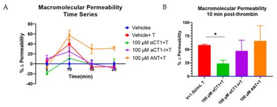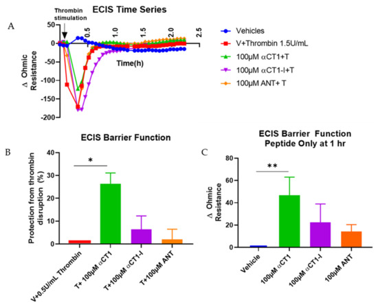 The barrier integrity of HMEC-1 (CDC, Atlanta, GA, USA) was measured using ECIS Z Theta system (Applied Biophysics, Troy, NY, USA). HMEC-1 monolayers with a seeding density of 7.50 × 104 cells/cm2 were grown to confluence (24–72 h) on collagen I-coated 8 W 10E+ electrodes. After cell sedimentation and attachment to the electrode surface within 30 min at room temperature, the 8-well arrays were placed inside the ECIS® device for impedance monitoring. All ECIS® measurements were analyzed at an Alternating Current (AC) frequency of 32 kHz, which was identified as the most sensitive frequency for this cell type (e.g., frequency at which maximum difference between cell-containing and cell-free measurements was achieved), each well measured every 2–4 min. At 1 h prior to treatment, media were exchanged with 360 µL fresh media. Test reagents were diluted in prewarmed medium. A volume of 20 µL peptide/media solution (αCT1, αCT1-I, antennapedia sequence (ANT)) was added to a final concentration of 100 µM. Cells were incubated in peptide for 1 h, then 20 µL thrombin/Fetal Bovine Serum (FBS)-free media solution was added to a final concentration of 0.5 U/mL. Approximately 5 min following thrombin addition, peptide-induced barrier function protection was calculated as the percentage of barrier protection from thrombin disruption = [(ohmic resistance peptide- ohmic resistance of thrombin)/ (ohmic resistance thrombin − ohmic resistance vehicle control)] × 100%. The effects of peptides alone on barrier function were calculated as the change in ohmic resistance compared to vehicle control (ohmic resistance peptide-ohmic resistance vehicle).