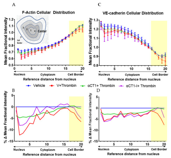 To quantify these changes, normalized intensities of F-actin and VE-cadherin immunolabeling were measured at 20 successive equivalently spaced intervals from the nucleus to the peripheral border of cells in the different treatment groups, as detailed in methods (see diagram in Figure 6A). Statistically significant differences in the cellular distribution of F-actin and VE-cadherin between the treatment conditions compared to thrombin alone are displayed in Figure 6 and in Supplemental Table S1. Overall, F-actin distribution increased more or less linearly from the cell nucleus outward to the cell periphery, peaking in mean fractional intensity near the cell periphery (Figure 6A). VE-cadherin distribution showed an opposite trend, though with an upward inflection in fractional intensity in region 17, located just a few radii inward from cell borders. Importantly, αCT1, but not αCT1-I, pretreatment inhibited the thrombin-induced changes in F-actin morphology, consistent with barrier function effects described previously (Figure 6B). This αCT1-associated effect, compared to αCT1-I, was marked by a significant increase in the proportion of peripherally located cortical actin, simultaneous with increase in VE-cadherin at cell–cell borders. See Figure 6A,C for mean fractional intensity values, and Figure 6B,D for vehicle baseline-subtracted values for F-actin and VE-cadherin, respectively. αCT1, but not αCT1-I, also prevented thrombin-induced reduction in VE-cadherin cellular distribution in the four peripheral-most cell compartments, while changes were not significant around the cell center—as indicated by the yellow-highlighted regions on the graphs shown in Figure 6. These data indicated that αCT1 required ZO1 binding competency to protect against thrombin-induced barrier function-associated changes in F-actin and VE-cadherin.