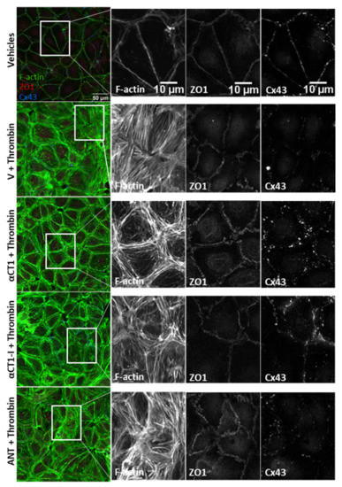 A major finding of this study is that αCT1 inhibits thrombin-induced attenuation of cortical actin and F-actin stress fiber formation. In intact endothelial barriers, cortical actin, in association with junctional complexes, exerts outward directed tension between cells, in dynamic balance with opposing inward contractile forces within cells. The actin stress fiber phenotype induced by thrombin shifts the balance of forces within and between cells, resulting in a disruption of cell contacts, formation of extracellular gaps and breakdown of barrier properties ([3,11,36]—see also Figure 11). In addition to thrombin, numerous other chemical and physical stressors, including histamine, lipopolysaccharide, endotoxin, Tissue Necrosis Factor (TNF), and shear stress, cause similar shifts in the balance of intra- and intercellular forces, together with loss of barrier patency via the same actinomyosin-based mechanism. For example, Mehta and colleagues (2002) showed that pretreating Human Pulmonary Artery Endothelial Cells (HPAEC) with latrunculin-A (Lat-A), a toxin known to prevent F-actin assembly, inhibited thrombin-induced endothelial cell retraction and decreased loss of transepithelial electrical resistance (TEER) [44] Pertinent to the current study, a report by Chen and colleagues (2015) found that αCT1 produced derangement of cytoskeletal fibers when applied to brain endothelial cells, including formation of cytoplasmic actin-rich node-like structures [37]. Interestingly, the authors also reported that these results could be recapitulated by over- expressing a PDZ2 domain-deleted ZO1 mutant, suggesting that the Cx43-binding domain of ZO1 targeted by αCT1 was necessary for the observed effects on actin cytoskeleton organization.