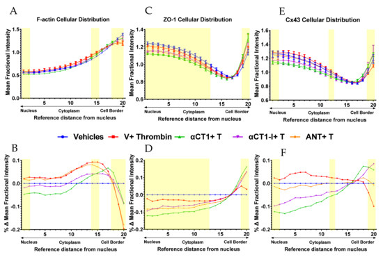 Quantification of αCT1 inhibition of thrombin-induced shift in endothelial F-actin distribution in association with ZO1 and Cx43 remodeling in HDMECs. (A,C,E) The radial distributions of F-actin (top left) and ZO1 (top middle) and Cx43 (top right)) were measured as the mean fractional intensity at a given cell radius, calculated as fraction of total intensity normalized by fraction of pixels at a given radius. Cell diagram of regions 1–20 indicated in top left figure. (B,D,F) F-actin (bottom left) and ZO1 (bottom middle) and Cx43 (bottom right), vehicle-subtracted values calculated as percentage difference from vehicle 100% (Value-Vehicle)/Vehicle). N = 3. Yellow highlighted bar indicates where αCT1+T, but not αCT1-I+T or ANT+T is significant compared to thrombin alone.
