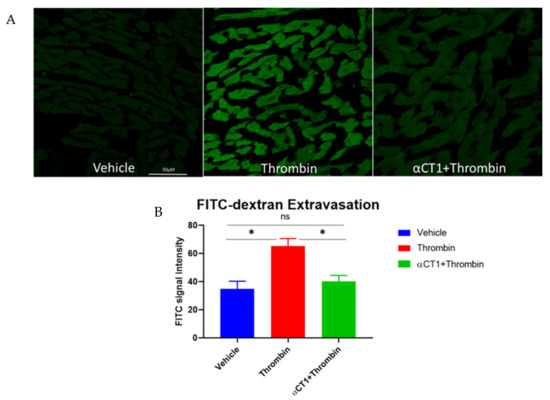 As mentioned earlier, a cardiovascular protective effect of αCT1 was hypothesized to in part result from the peptide’s targeting to the coronary vasculature within the heart [33]. Thus, to determine if the in vitro endothelial barrier protection by αCT1 applied to an ex vivo setting, vascular leakage within peptide-treated mouse hearts was assessed. Langendorff-perfused mouse hearts were perfused for 20 min with Tyrode’s solution with or without αCT1 (100 μM), followed by 40 min with thrombin (1.5 U/mL). The permeability tracer FITC-dextran (10 mg/mL), a similar tracer used previously in the Transwell permeability assay (Figure 3), was added to the final 10 mL of perfusate. Overall, as assessed by quantitative confocal microscopy of cryosections from the hearts, thrombin significantly increased FITC extravasation relative to control (by ~88%). αCT1 treatment markedly decreased FITC extravasation compared to thrombin alone (p < 0.05 vs. thrombin), nearly restoring it to vehicle control levels (Figure 10).