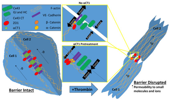 In the current study, αCT1 maintained F-actin at the cell periphery under thrombin stimulation, while at the same time augmenting the border localization of Cx43, ZO1, and VE-cadherin. It is well established that stabilization of barrier function is often marked by restoration of AJ and TJ proteins to cell–cell borders [14,51]. Furthermore, multiple studies have demonstrated cell–cell adhesive roles for Cx43 GJ [40,52,53], and the upregulation of GJ Cx43 has been shown to promote a stabilization of cortical actin [18,54,55]. Under normal conditions, cortical actin promotes the stability of cell–cell interactions by tethering these junctional structures (e.g., GJ, TJ, and AJ) with other intracellular components [10,11,12]. Taken together, our data suggest that αCT1 protects barrier function first and foremost by inhibiting a shift in F-actin away from cell-to-cell contacts, thereby stabilizing transcellular interacting proteins, VE-cadherin and Cx43, and the TJ-scaffolding protein ZO1. Figure 11 provides a model of how αCT1 pretreatment could enhance outward directed tension and minimize inward directed pulling forces via modulation of actin and junctional protein distribution, with downstream effects on endothelial gap formation and barrier permeability.