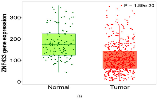 The TNM plotter (https://www.tnmplot.com (accessed on 8 May 2021)) is a web application that enables a real-time comparison of gene-expression changes between tumor, normal, and metastatic tissues amongst different types of platforms across all genes. The software was used to assess ZNF433 expression using the TCGA datasets—a direct comparison between tumor and normal tissues was made by running the Mann–Whitney test [19].