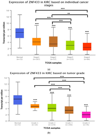 In this study, UALCAN (http://ualcan.path.uab.edu/analysis.html (accessed on 5 May 2021)) was utilized to assess the levels of transcripts in clear-cell renal cell carcinomas from the TCGA dataset. UALCAN is an online, open-access platform that contains TCGA raw data, including gene expression, protein expression (CPTAC dataset), promoter methylation, miRNA expression, and clinicopathological data [18]. UALCAN allows users to query the gene of interest and compare its expression to clinicopathological features. Specifically, UALCAN was employed in our study to analyze the mRNA expression of ZNF433 in relation to the clinicopathological parameters (cancer stage, renal cancer subtypes, metastasis, and grade) of ccRCC.