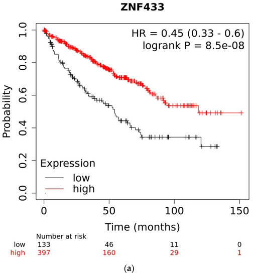 The online Kaplan–Meier plotter program (https://kmplot.com/analysis, accessed on 7 May 2021) was used to determine the prognostic value of ZNF433 expression in clear-cell renal cell carcinoma. Specifically, Kaplan–Meier survival plots were generated to ascertain whether there was a correlation between ZNF433 expression and the overall survival (OS) of clear-cell renal cell carcinoma patients [23,24]. To assess the prognostic value of ZNF433, each percentile (of expression) between the lower and upper quartiles was computed, and the best-performing threshold was used as the final cutoff in a univariate Cox regression analysis. The Kaplan–Meier survival plot and the hazard ratio with 95% confidence intervals and logrank p value were calculated and plotted in R using the ‘‘survplot’’ function of the ‘‘survival’’ Bioconductor package [23,24].