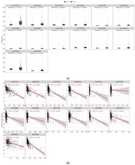 Methylation status was assessed using MethSurv (https://biit.cs.ut.ee/methsurv, accessed on 9 May 2021). This web-based tool enables researchers to perform survival analysis for a CpG located in or around the proximity of a query gene using the TGCA dataset [25]. To ascertain if methylation status was associated with gene expression, we utilized the Shiny Methylation Analysis Resource Tool (SMART) web-based program. The SMART application integrates multiomics and clinical data with DNA methylation. It provides key interactive and customized functions, including CpG visualization, pan-cancer methylation profile, differential methylation analysis, correlation analysis, and survival analysis [26].