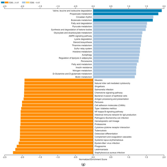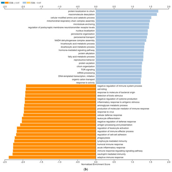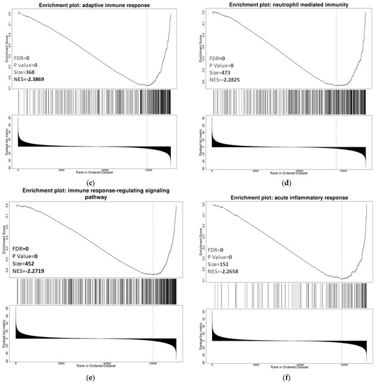 Since there is limited information regarding ZNF433 target genes, we examined whether genes correlated highly with ZNF433 expression were components of over-represented pathways. Specifically, we used the gene set enrichment analysis (GSEA) method to analyze the GO Biological Process and KEGG databases to identify enriched pathways (Figure 6a–k). Figure 6a provides a volcano plot of the negatively (green line) and positively (red lines) correlated genes associated with ZNF433 expression. Figure 6b provides the GSEA analysis of the pathways enriched among genes positively (blue bars) and inversely (orange bars) co-expressed with ZNF433 using the GO Biological Process database. The only pathways that were significantly enriched (p < 0.05, FDR < 0.05) were those connected to the genes inversely co-expressed with ZNF433. Moreover, the enriched pathways were all associated with immune system response/regulation. Figure 6c–f provide the enrichment plots of the top four pathways enriched among the inversely co-expressed genes. These enriched pathways were the adaptive immune response (GO:0002250), neutrophil mediated immunity (GO:0002446), immune response-regulating signaling pathway (GO:0002764), and acute inflammatory response (GO:0002526). The most enriched pathways among the positively correlated genes included those associated with mitochondria/cellular metabolism and protein transport, including GO:0061512: protein localization to cilium (NES = 1.67, FDR = 0.2812, p = 0); GO:0098732: macromolecule diacylation (NES = 1.623, FDR = 0.262, p = 0.005); and GO:0033108: mitochondrial respiratory chain complex assembly (NES = 1.47, FDR = 0.55, p = 0.005). Similarly, GSEA analysis of the KEGG database revealed that immune-related pathways were predominantly enriched among inversely correlated genes (Figure 6g). Indeed, nine out of the 10 most significantly enriched pathways among inversely correlated genes were associated with defense against infectious organisms (Figure 6g). These included hsa05140 (Leishmaniasis), hsa04145 (Phagosome), hsa05150 (Staphylococcus aureus infection), and hsa05169 (Epstein–Barr infection). Their respective enrichment plots are provided in Figure 6h–k. For genes positively co-expressed with ZNF433, GSEA analysis of the KEGG database revealed that most significant pathways associated with cellular metabolism/energy were enriched, and included hsa00280: valine, leucine, and isoleucine degradation (NES = 1.93, FDR = 0.001, p = 0); hsa00640: propanoate metabolism (NES = 1.86, FDR = 0.005, p = 0); and hsa00650: butanoate metabolism (NES = 1.70, FDR = 0.04, p = 0).