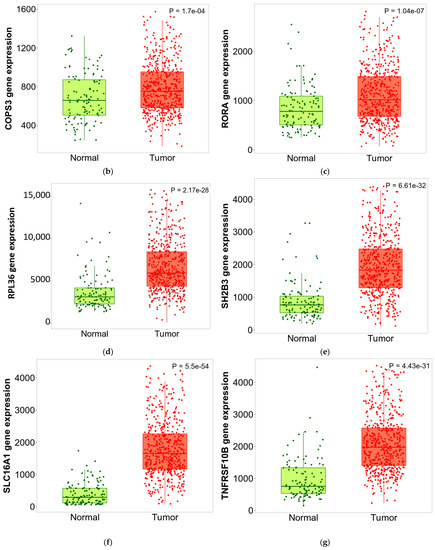 - Chandrashekar, D.S.; Bashel, B.; Balasubramanya, S.A.H.; Creighton, C.J.; Ponce-Rodriguez, I.; Chakravarthi, B.V.; Varambally, S. UALCAN: A Portal for Facilitating Tumor Subgroup Gene Expression and Survival Analyses. Neoplasia 2017, 19, 649–658. [Google Scholar] [CrossRef]