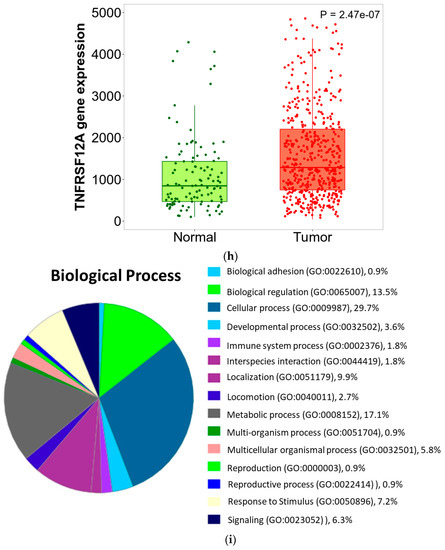 Given that ZNF433 is a putative transcription factor, we identified potential target genes using the GSEA Molecular Signature Database (Table 4). We examined the expression of ZNF433 target genes in clear-cell renal cell carcinoma. Several target genes were differentially expressed, and associated with cancer suppression, progression, or tumorigenesis (Figure 6a,b). The most notable target genes (Figure 7b–h) were potential oncogenes/promoters of tumorigenesis (COPS3, RORA, SLC16A1), and potential tumor suppressors (RPL36, SH2B3, TNFRSF10B, TNFRSF12A) [45,46,47,48]. In addition, we used PANTHER to annotate ZNF433 target genes (Figure 7h,i). The largest portion of genes (29.7%) were associated with biological processes (GO:0009987) (Figure 7i), and within the category of biological processes, the largest number of genes were involved in cellular metabolic processes (GO:0044237) (Figure 7h,i). However, given the small numbers of possible target genes, no pathway or process was statistically over-represented. Nonetheless, it should be noted that clear-cell renal cell carcinoma is especially characterized by impaired cellular metabolism and metabolic reprogramming characterized by increased glycolysis and lactate production, and abnormal accumulations of lipids and reduced oxidative phosphorylation [49,50].