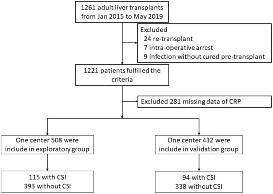 The following are available online at https://www.mdpi.com/article/10.3390/biom11081195/s1, Figures S1 and S2: Title, Tables S1–S10. Table S1. Comparative analysis between patients with vs. without data of CRP. Table S2. Systemic inflammatory response markers in patients separated by infection pre-transplant. Table S3. Systemic inflammatory response markers in patients separated by organ failure number.Table S4. Systemic inflammatory response markers in patients separated by MELD score quartile. Table S5. Systemic inflammatory response markers in patients separated by liver tumor. Table S6. Exclusion of diagnosis CSI within 1, 2, and 5 day(s) after inclusion in the cohort. Table S7. Multivariate analysis of risk factors for 30-day CSI compared with the result of competing risk model. Table S8. Performances of systemic inflammatory response markers and MELD score in the diagnosis of CSI after transplantation. Table S9. Comparative Analysis between patients with vs. without LPS Data. Table S10. Association between LPS level pre-transplant and 30-day CSI after transplantation. Figure S1. Kaplan-Meier curves illustrating the differences in 30-day CSI in groups stratified by CRP cutoff value of 9.48 mg/L and organ failure number. (A) Exploratory group; (B) validation group. Figure S2. Correlation of LPS (lipopolysaccharide) with selected systemic inflammatory response markers. Abbreviations, LPS, lipopolysaccharide; CRP, C-reactive protein; WBC, White blood cell; NLR, neutrophil-lymphocyte ratio; SII, systemic immune-inflammation index.