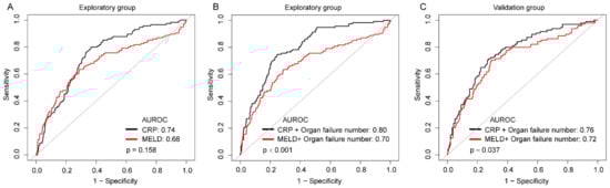 Predictive performance of CRP in 30-day CSI. (A) Receiver operated characteristic (ROC) curves for the established MELD score and biomarkers of systemic inflammation in relation to 30-day CSI. (B) Receiver operated characteristic (ROC) curves for the combination of organ failure number and CRP or MELD score in exploratory group. (C) Receiver operated characteristic (ROC) curves for the combination of organ failure number and CRP or MELD score in the validation group.