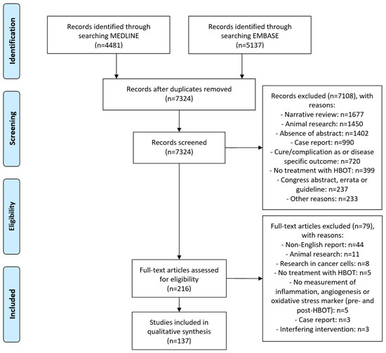 The search retrieved 9618 records. After removing duplicates and screening of title and abstract, 216 studies were screened full-text. Finally, 137 articles were included in this review (see Figure 1). Most of the included articles were clinical studies (n = 98) and performed in patients with diabetes mellitus and/or non-healing chronic wounds (n = 27). Furthermore, 27 articles describing the effect of HBOT in healthy volunteers (including divers) were found. Sixteen included studies reported on other biomarkers than described in Table 1, Table 2 and Table 3 (data not shown) [17,18,19,20,21,22,23,24,25,26,27,28,29,30,31,32].