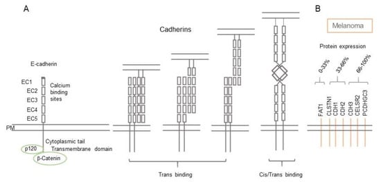 Cadherins, the calcium-dependent adhesion protein family, are molecules that facilitate the adherence of cells via adherens junctions or desmosomes. Cadherins are some of the most common cell–cell adhering molecules, with 115 cadherin family members present in the human genome, which can further be divided into the classical (four members), desmosomal (seven members), protocadherin (72 members), and unconventional (32 members) sub-families (Table S1). Cadherins usually operate in a homotypic fashion, though they can also adhere heterotrophically [23] (Figure 1A). The extracellular binding region of members of the cadherin family consists of 5 extracellular calcium (EC1–EC5) dependent repeat regions that allow for strong binding, mainly facilitated by EC1 and EC2 [24]. They gain their adherence strength via an intracellular structural region, which binds to actin filaments in the cell. The cadherin family plays two major roles in the physiological skin, by connecting cells together in the epidermis (e.g., melanocytes and keratinocytes), and by facilitating the binding of cells to the BM, in a desmosome cell-BM interaction (along with plakoglobin and desmoplakin) [25]. The desmosome interactions are known as the spot welds of cell–cell adhesion and are important in the epithelial and cardiac structures allowing for strength in mechanically involved tissue [26].