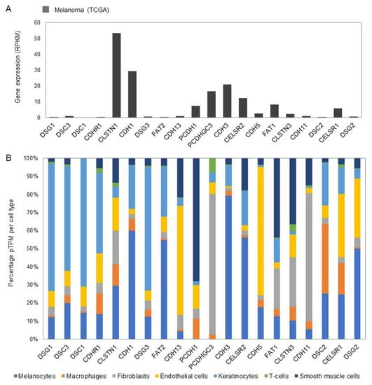 Among the 115 cadherin family members, 90 genes are expressed in healthy human skin (Table S1) [19,20]. E-cadherin is among the most highly expressed genes within melanocytes and keratinocytes in normal skin (Table S1), while N-cadherin is barely expressed at all (0.2 pTPM, protein Transcripts per million mRNA measurement unit). Other highly expressed genes are desmoglein-1, desmocollin-3 (DSC3), desmocollin-1 (DSC1), cadherin-related family member 1 (CDHR1), calsyntenin-1 (CLSTN1), desmoglein-3 (DSG3), and protocadherin Fat 2 (FAT2). Gene expression data in individual cell types show that the top 20 most highly expressed genes are generally highest expressed in melanocytes, with exception of cadherin-13 (CDH13) (highest expression in endothelial cells), protocadherin-1 (PCDH1) (highest expression in smooth muscle cells), protocadherin gamma-C3 (PCDHGC3) (highest expression in fibroblasts), and cadherin-11 (CDH11) (highest expression in fibroblasts) (Figure 2B). It is interesting to note that the cadherins that have reduced protein expression levels in melanoma (Figure 2A) tend to be mainly expressed on melanocytes and keratinocytes and are approximately balanced in skin (Figure 2B) (e.g., desmoglein-1, desmocollin-3, desmocollin-1, calsyntenin-1, desmoglein-3), reinforcing that a loss of cell adhesion between melanocytes and keratinocytes is a critical event in melanoma. In contrast, cadherin genes that are highly expressed in melanoma (Figure 1B and Figure 2A) tend to have low expression in normal skin in keratinocytes (e.g., calsyntenin-1 and cadherin-3), but their expression in endothelial cells, macrophages, and fibroblasts (e.g., protocadherin-1) may enable ‘wrong’ or ‘unphysiological’ cell–cell contacts promoting invasion and metastasis.