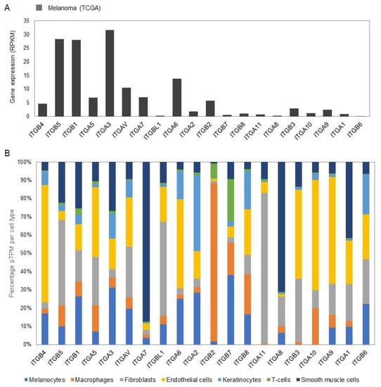 The integrin family consists of 27 members, of which transcripts for all genes are detected in normal human skin—albeit some with low levels (Table S2) [19,20]. Among the most highly expressed genes in normal skin, 10 integrin members are very highly expressed (ITGB4, ITGB5, ITGB1, ITGA5, ITGA3, ITGAV, ITGA7, ITGBL1, ITGA6, and ITGA2). These are generally most highly expressed in melanocytes, followed by endothelial cells, fibroblasts, smooth muscle cells (mainly ITGA7), keratinocytes and macrophages (Figure 4B). Integrin beta-2 (ITGB2) is highly expressed in macrophages, integrin alpha-11 (ITGA11) in fibroblast cells, and integrin beta-3 (ITGB3) and integrin alpha-10 (ITGA10) on endothelial cells. The expression profile in melanoma for the most expressed genes in normal skin tends to follow the same profile, except that integrin beta-4 (ITGB4) and integrin alpha-5 (ITGA5) have lower expression levels, and integrin alpha-3 (ITGA3) and integrin alpha-6 (ITGA6) have higher expression levels in melanoma (Figure 4).