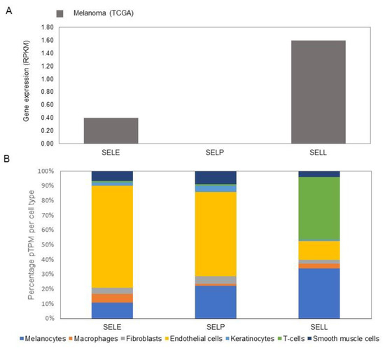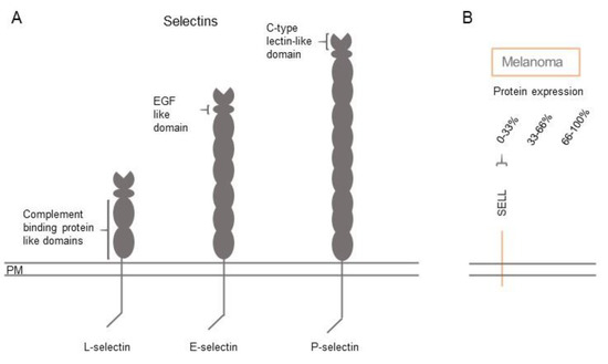 Of the three selectin members, E-selectin is most highly expressed in human skin, followed by P- and L-selectin (Table S1; Figure 8B) [19,20]. E- and P-selectin are highest expressed in melanocytes and endothelial cells, while L-selectin is predominantly found in melanocytes and T-cells. Though, the selectin family is not often expressed on melanocytes/melanomas (Figure 8), the selectins expressed on the surrounding microenvironment cells (Figure 8B) are expected to have a significant influence on the progression and especially the migration/metastasis of the melanoma cells.