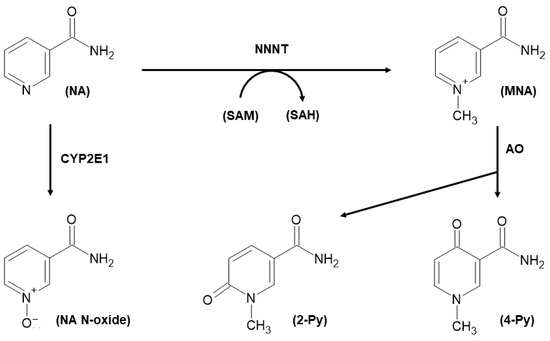The enzyme nicotinamide N-methyltransferase (NNMT, EC 2.1.1.1) catalyzes the transfer of the methyl group from the S-adenosyl-L-methionine (SAM) universal donor to nicotinamide (NA) to form N1-methylnicotinamide (MNA) and S-adenosyl-L-homocysteine (SAH) [1,2,3]. MNA can be further converted into N1-methyl-2-pyridone-5-carboxamide (2-Py) or N1-methyl-4-pyridone-3-carboxamide (4-Py), through the catalysis exerted by aldehyde oxidase (AO) [4]. All three catabolites (NA, 2-Py and 4-Py) are subsequently excreted via urine [5]. Alternatively, NA excess can be also metabolized through oxidation rather than methylation. Indeed, within the endoplasmic reticulum of hepatocytes, the CYP2E1 enzyme system is able to oxidize NA to nicotinamide N-oxide (NA N-oxide) that undergoes further urinary elimination [6] (Figure 1).