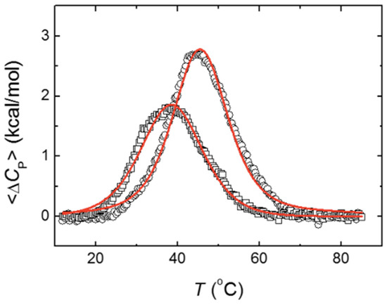 The first approach in DSC experimental analysis consisted of applying a model-free data analysis for discriminating between different possibilities: two-state unfolding, non-two-state unfolding, and oligomer unfolding of the protein. From the thermogram (excess molar heat capacity of the protein as a function of the temperature, Δ