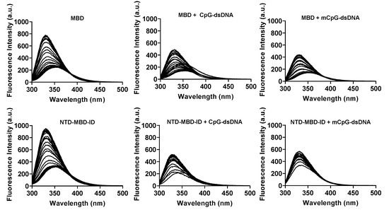 Regarding the experiments with dsDNA, the same phenomena previously observed by fluorescence thermal denaturations were also observed by chemical denaturations: the stabilization effect induced by dsDNA, the larger stabilization effect of dsDNA on NTD-MBD-ID compared to that on MBD, and the larger stabilization exerted by methylated mCpG-dsDNA compared to unmethylated CpG-dsDNA [